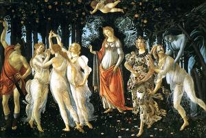 Biglietto d'auguri con riproduzione de La Primavera di Botticelli.