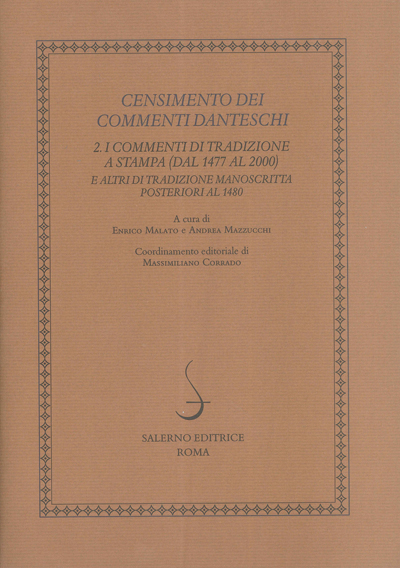 Con il presente volume, dedicato ai Commenti di tradizione a stampa (dal 1477 al 2000) e altri di tradizione manoscritta posteriori al 1480, si conclude, dopo circa un ventennio di lavoro, l'impegnativo progetto editoriale del «Censimento dei commenti danteschi»: la prima ricognizione critica completa di tutta la tradizione manoscritta e a stampa dell'esegesi dantesca, che rappresenta uno strumento indispensabile per gli studiosi e i bibliografi. Il volume offre una rassegna tendenzialmente esaustiva di tutti i commenti danteschi prodotti a séguito dell'invenzione a stampa, partendo da quello di Martino Paolo Nibia (umanisticamente detto il Nidobeato), edito nel 1477-1478, fino ad arrivare ai grandi nomi del dantismo novecentesco, senza trascurare i casi di commenti diffusi in forma manoscritta anche dopo l'avvento della tecnica tipografica (Ludovico Castelvetro, Gabriele Trifone). Per ogni singolo commentatore viene offerto un dettagliato profilo critico-biografico, corredato da una specifica bibliografia, nonché una puntuale disamina dell'apparato esegetico.
