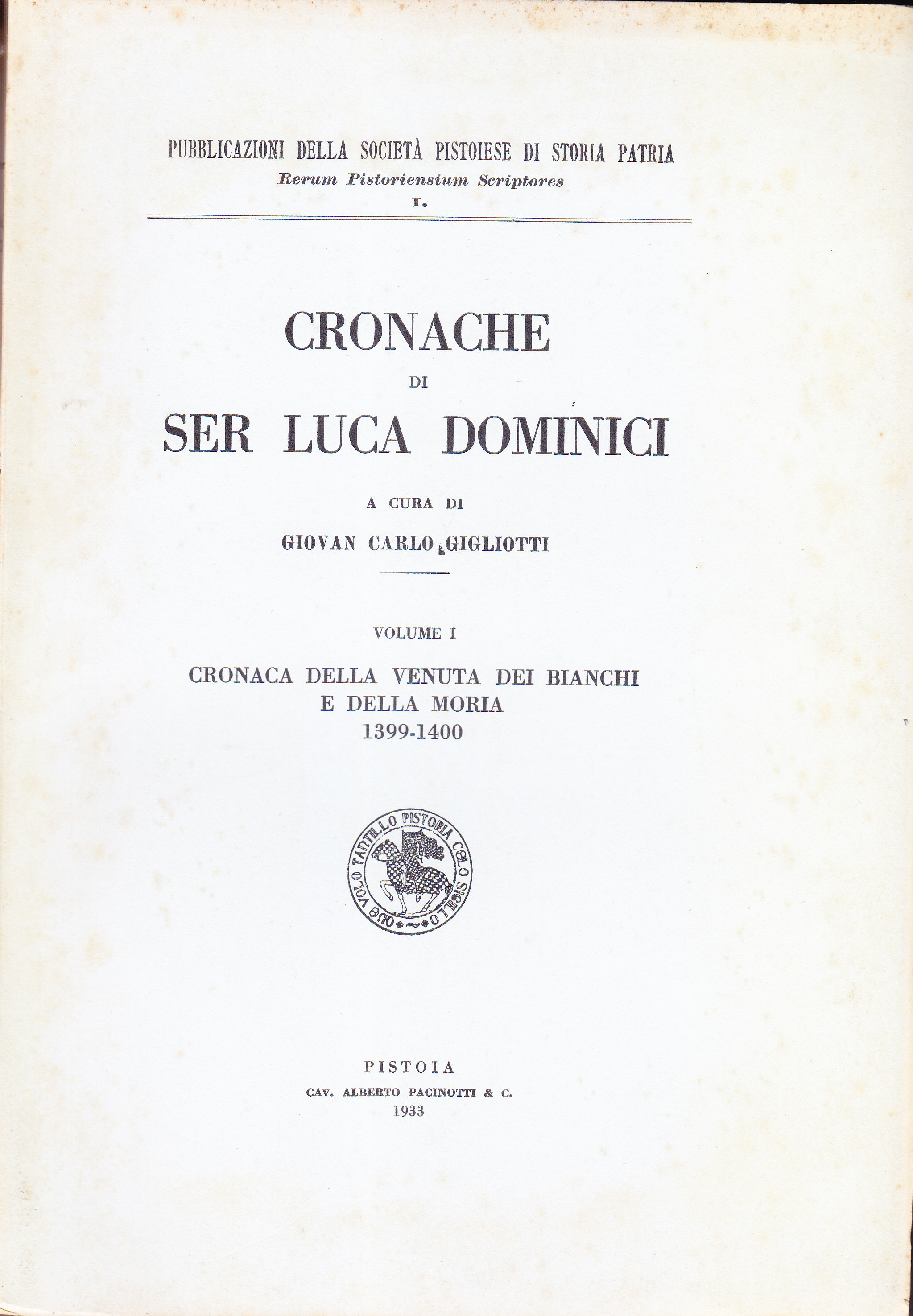 TITOLO/DENOMINAZIONE: Cronache di ser Luca Dominici. Volume I: Cronaca della venuta dei Bianchi e della moria 1399-1400; Volume II: Cronaca seconda