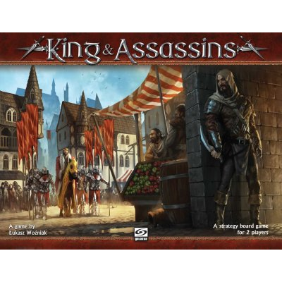 The gameplay is based upon Action Cards which show a limited number of Action Points available to both sides. First, the king and his knights move around the board securing their position or eliminating dangers by pushing aside the crowd, then the assassins hidden among the crowd prepare for their lethal strike by killing guards or making the king's progress slower. It's up to the players to make the most of the Action Points available in the current round. The king's player wins if he manages to escape from the board using one of the exits or if his knights eliminate all the assassins. The assassins win if they kill the king by dealing him two wounds or stall him long enough so that the Action Card deck is depleted.