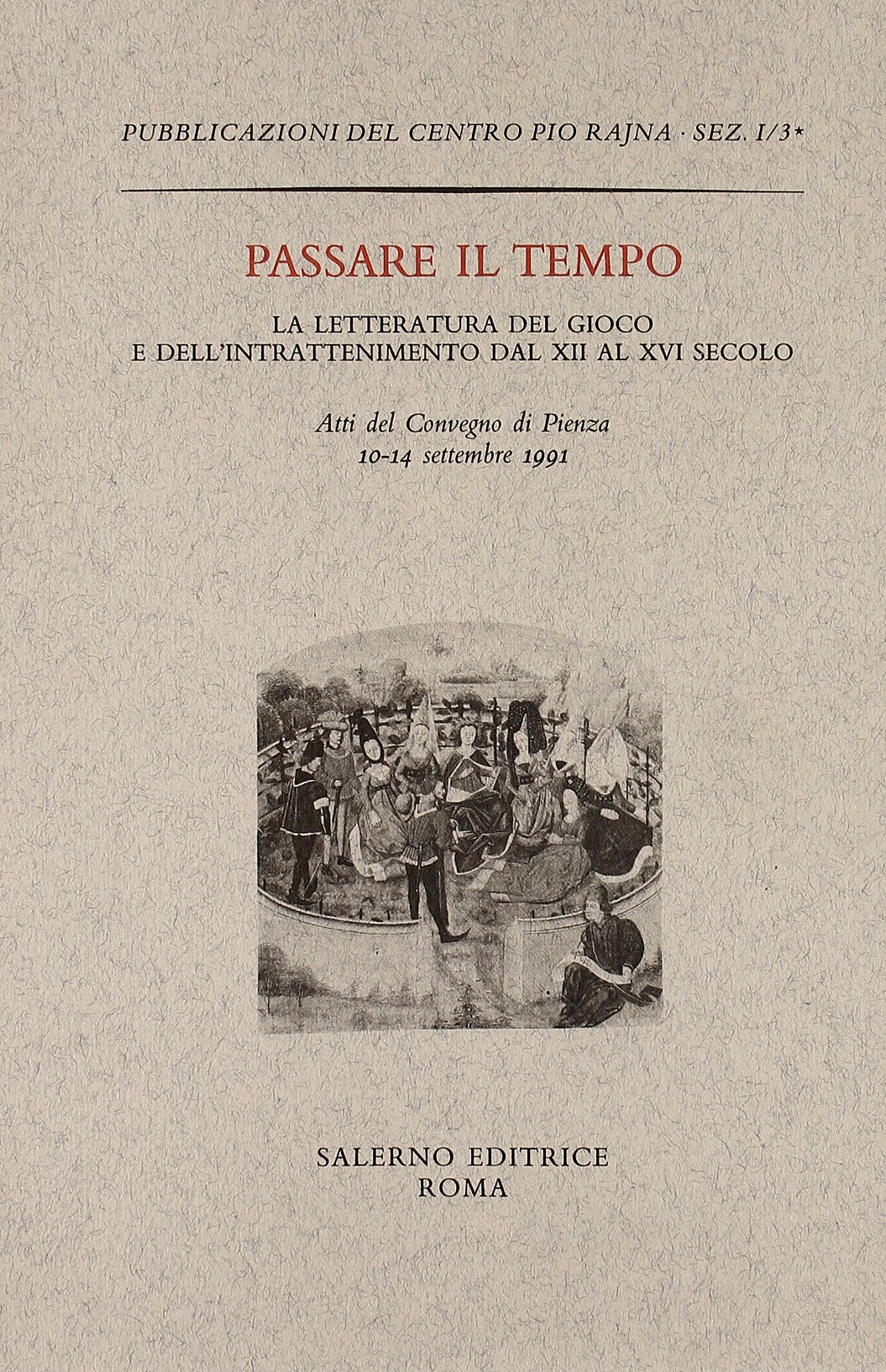 Promosso dal «Centro Pio Rajna. Centro di studi per la ricerca letteraria, linguistica e filologica», e sotto gli auspici dell'Università degli Studi di Siena, si è svolto dal 10 al 14 settembre 1991, presso la Sala Convegni del Comune di Pienza, un Convegno Internazionale sul tema: «Passare il tempo. La letteratura del gioco e dell'intrattenimento dal XII al XVI secolo». Orientato su di un argomento in apparenza "leggero", in realtà il Convegno ha individuato una serie di problemi di grande rilevanza storico-critica: a partire infatti dall'alternativa "letteratura del gioco/ letteratura come gioco", si è giunti a fissare l'attenzione sulla questione fondamentale dell'origine, dell'essenza, della funzione stessa sella letteratura. Dai precedenti latini e mediolatini, attraverso il Medioevo e il Rinascimento, fino alle soglie dell'età barocca, il "gioco" letterario è stato inseguito e studiato in tutte le sue multiformi manifestazioni, con l'attenzione rivolta ai modi e ai luoghi (Ferrara, Firenze, Napoli, Siena, ecc.) dell'attività ludica, in rapporto sempre serrato con il contesto storico-sociale in cui è fiorita. «Gioco della letteratura e gioco nella letteratura: ecco la scelta veramente erculea che ci ha presentato, anzi provocatoriamente sollecitato, il programma del Convegno. Il dissidio che ne nasce non ha caratterizzato solo i nostri interventi, ma connota tutta la problematica di cui abbiamo voluto occuparci»: così, con stringente efficacia, Michelangelo Picone sintetizza, nel bilancio conclusivo dei lavori, gli obiettivi e al contempo i risultati del Convegno. Quali si trovano ora affidati a questi due ricchi volumi di Atti, impreziositi da numerose tavole f.t. e completati da ampi Indici finali, dei nomi, dei manoscritti e dei temi affrontati.