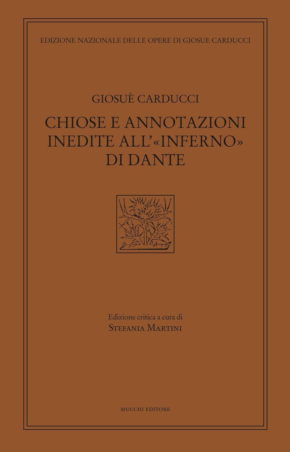 Che il testo sia la prima preoccupazione di Carducci commentatore dei classici, è noto; e lo dimostrano ancor più queste chiose e annotazioni private, frammentarie e composite all'"Inferno" dantesco, con ogni probabilità stratificate nell'arco di un trentennio. Già in una lettera del 1874 a Lidia lo stesso Carducci precisava il suo modus operandi nelle vesti di professore: nelle sue lezioni sui classici era solito scrivere "la sola parte filologica"; per la "parte estetica" si lasciava andare a dire "cose improvvise", ossia, comprendiamo, si affidava ai suoi straordinari acume logico e talento intuitivo, alla sua erudizione di letterato e alla sua ipersensibilità di poeta. Carducci fece interfoliare con due carte l'"Inferno" e il "Purgatorio" dichiarati da Brunone Bianchi (Le Monnier 1854). Nelle carte aggiunte alla prima cantica le facciate annotate sono trecentoundici, le facciate mute centosessantasette. I canti sono disparmente annotati. Ma le duecentoquaranta pagine del testo a cura del Bianchi - ivi comprese le note - sono pressoché tutte chiosate con varianti in margine, in interlinea.
