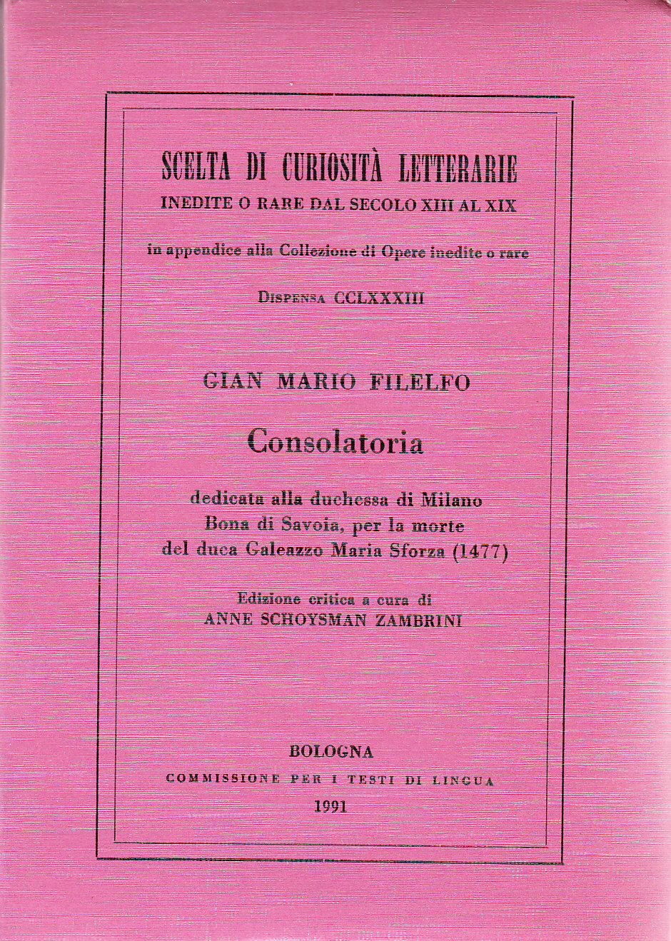 Opera dedicata alla duchessa di Milano Bona di Savoia, per la morte del duca Galeazzo Maria Sforza (1477), da Giovan Maria Filelfo, figlio del più noto umanista Francesco.