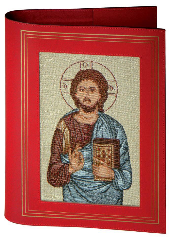 Copertina in vera pelle per lezionari con scritte in trancia oro. Al centro un’immagine in tessuto jacquard, ottenuta dall’intreccio di fili colorati e dorati lavorati al telaio, raffigurante Cristo datore di vita. La copertina è interamente prodotta e confezionata in Italia con certifi cazione di vera pelle di qualità Made in Italy.