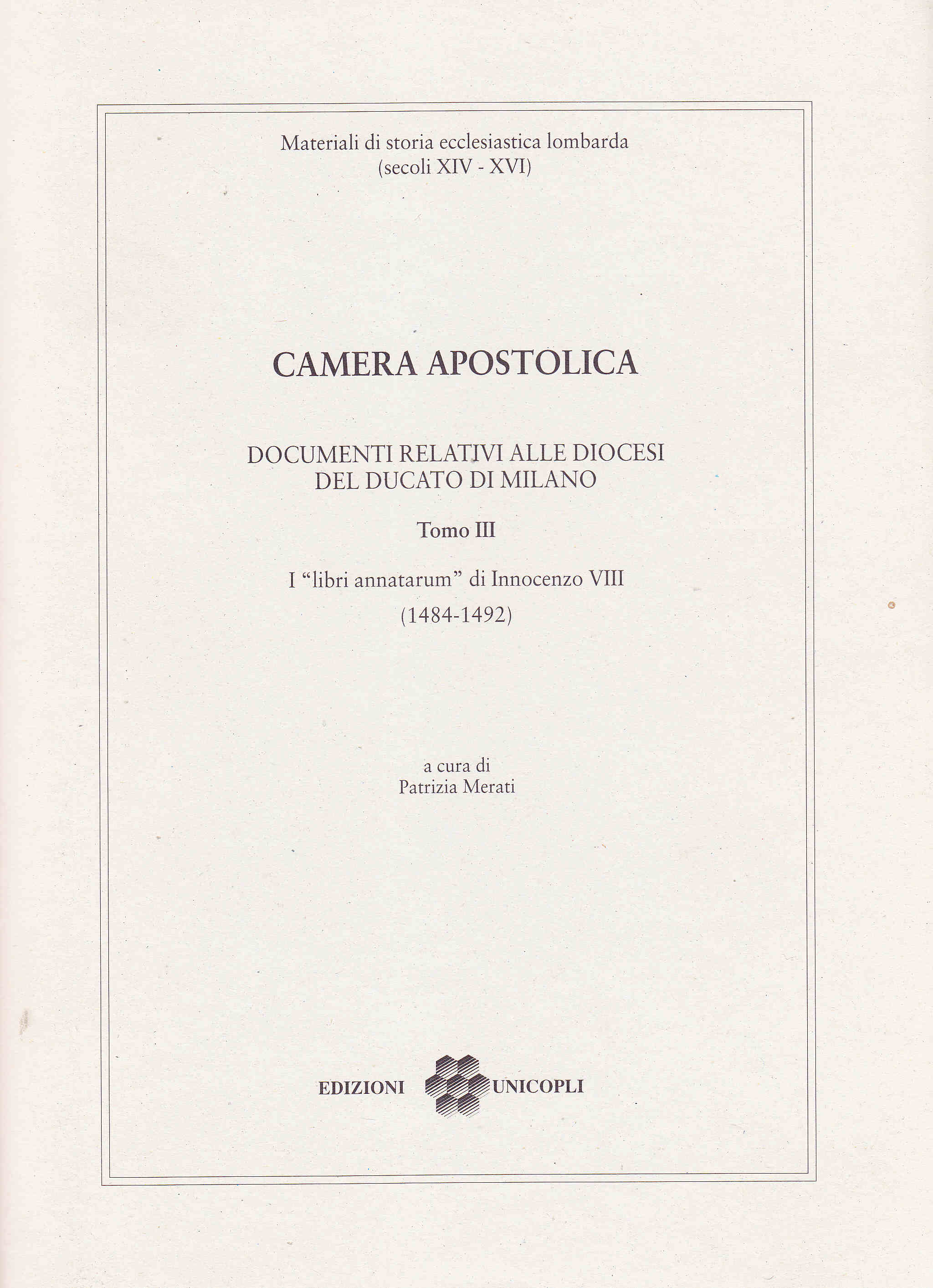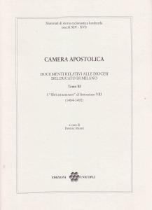 Si tratta dell'edizione di un particolare genere di fonte di documentaria prodotta dalla Camera Apostolica: i "libri annatarum", che contengono obbligazioni e note di restituzione relativa all'annata, ossia una tassa cui erano soggetti i detentori di benefici ecclesiatici. Sono stati presi in considerazione i documenti concernenti le diocesi appartenenti al ducato di Milano; l'arco cronologico esaminato è quello del pontificato di Innocenzo VIII (1482-1492).