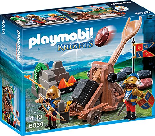 Catapulta dei cavalieri del Leone con avamposto, rocce da lancio, cavaliere e arciere con frecce infuocate.