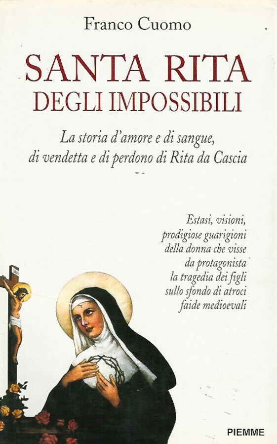 Rita da Cascia è detta “santa degli impossibili” per la straordinarietà dei miracoli che le vengono attribuiti, soprattutto in materia di guarigioni. Il suo culto ebbe origine intorno alla metà del ‘400, quando ancora era in vita, e fu inizialmente avvolto da un’aura talmente leggendaria da far sorgere nelle autorità ecclesiastiche il dubbio che non fosse mai esistita. Tant’è che la prima domanda posta ai testi nella causa di beatificazione fu se avessero certezza che questa suora così popolare, così prodiga di grazie, fosse realmente stata al mondo. Si appurò che era stata una taumaturga dagli eccezionali poteri e una mistica in grado di ascendere ai più elevati stati di estasi. Ma Rita ebbe anche una intensa vita profana, due figli e un appassionato amore coniugale, stroncato poi da una sanguinosa faida tra guelfi e ghibellini. A rendere più fosca la tragedia, dopo l’assassinio del marito, sopravvenne la morte dei figli, da Rita stessa invocata – a quanto si tramanda – perché non si macchiassero di vendetta.